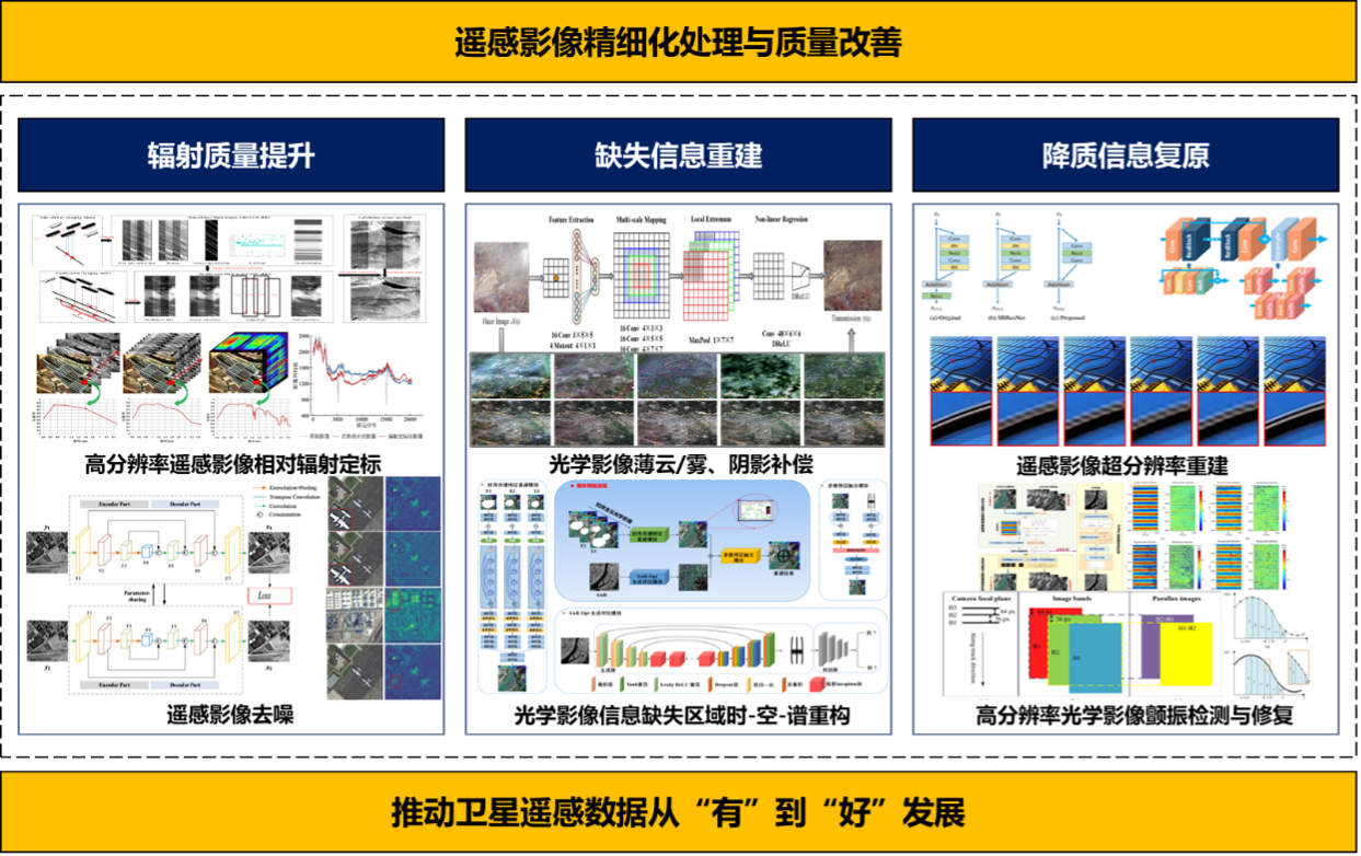 可见光、红外、高光谱、视频影像相对辐射定标与辐射校正、图像去噪、去云、去雾、图像融合、超分重建等,发挥多传感器互补优势,实现高分辨率遥感数据精细化处理与质量改善,推动卫星遥感数据从“有”到“好”发展。
